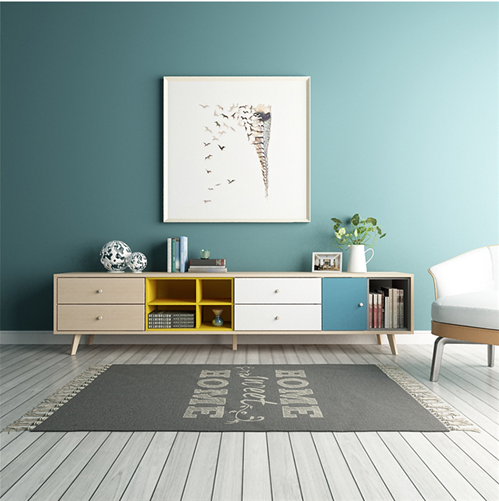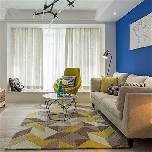 客廳是家里走動(dòng)十分頻繁的地方,所以在地毯的選擇方面好選擇耐磨、顏色耐臟的地毯。 幾何圖案的的地毯十分適合低矮的茶幾,這樣的組合方式令現(xiàn)代客廳顯得生氣勃勃。不規(guī)則形狀的地毯也可以放在單張椅子下面增加家居質(zhì)感。
