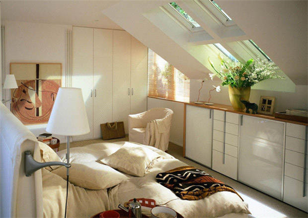 在斜房頂間的閣樓裝修上,就可以在矮的那邊就可以放上榻榻米,完全就不用怕頭碰著上方,在加上一個(gè)溫暖的壁燈,不僅能夠照明還能夠作為一個(gè)很好的裝飾。