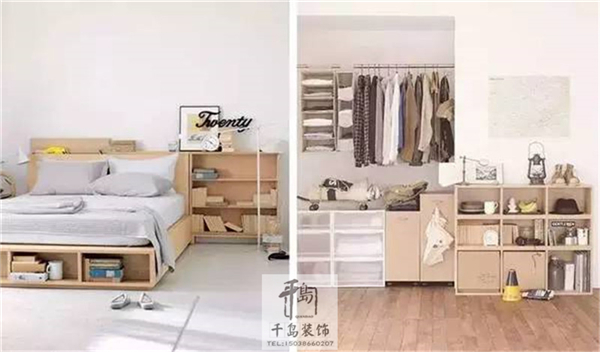 白色和原木色作為房間的基調(diào),并用統(tǒng)一規(guī)格的收納柜收納物品,空間呈現(xiàn)出一種干凈、素潔、寬敞的感覺。