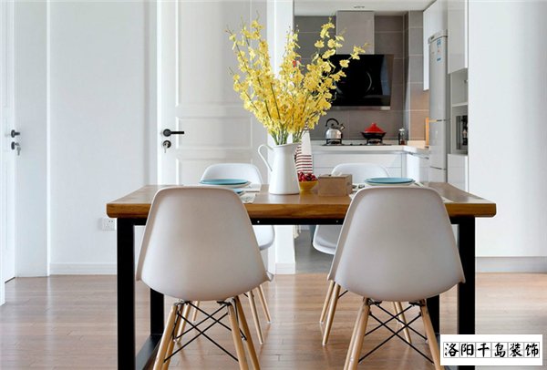 餐廳的空間不大,在廚房與客廳的過渡區(qū),硬裝為白色的墻面,原木色的地板,與整體風格契合,既樸實又簡潔。餐桌選用非常經典的北歐風格,不刻意修飾的桌面板材,配上粗壯的鐵藝腿部支撐,兼具了時尚和工業(yè)風的格調,再配上造型前衛(wèi)的休閑椅,令這個空間雖然簡單卻不孤單。桌面用陶瓷花瓶,配上鮮艷的仿真絹花裝點,給這塊空間帶來明媚的色彩。