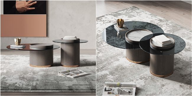 這套意式圓形茶幾打破傳統(tǒng)茶幾的形式,高低款式可以隨意組合,給人一種錯落有致的美。茶幾最吸引我的部分就是桌面的設(shè)計(jì),兩種不同的材質(zhì)結(jié)合,給人一種獨(dú)特的美。