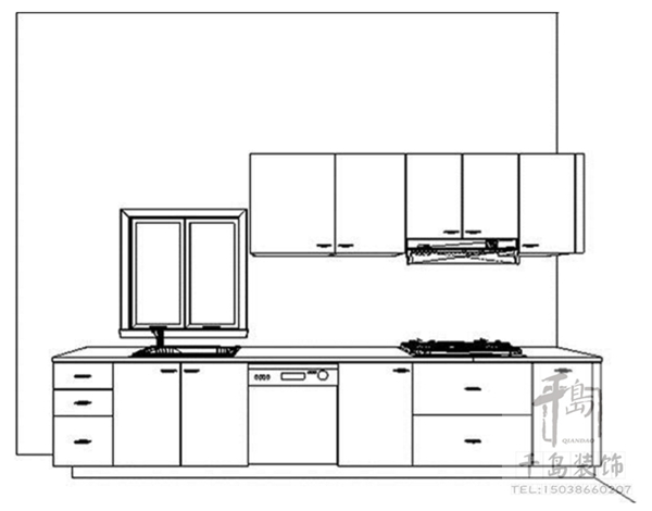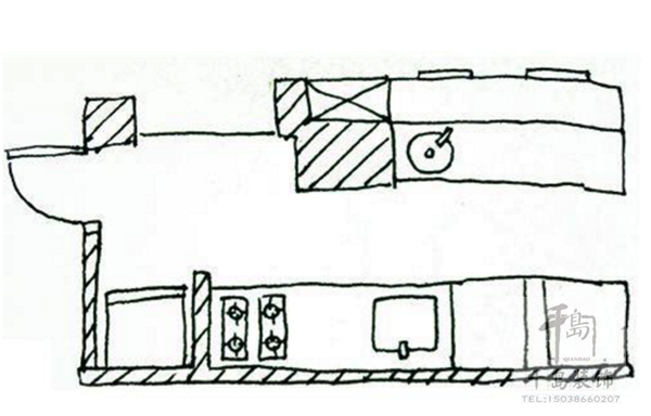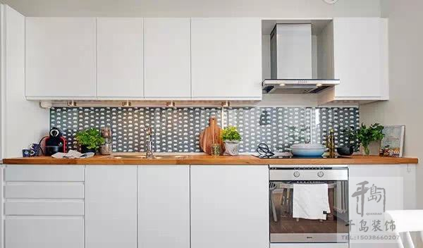 廚具主要是沿著墻面一字排開,區(qū)域劃分的重點為冰箱-工作臺-洗滌區(qū)-處理區(qū)-烹飪區(qū)-用膳區(qū),佳空間長度大約為2公尺。由于空間的限制,櫥柜應貼墻布置以適應空間的特點和滿足功能的需求,烹飪用具不能過多,對櫥柜高度要仔細安置。