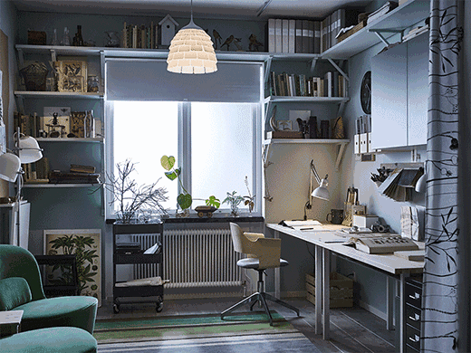 儲(chǔ)存柜與墻之間的縫隙也是好地方,放個(gè)書桌正合適!這簡(jiǎn)單的書桌,正是辦公的好地方。