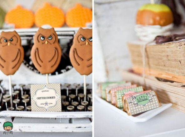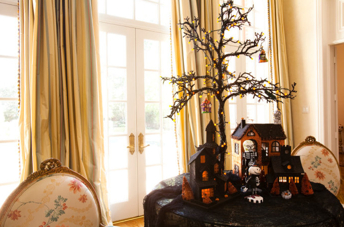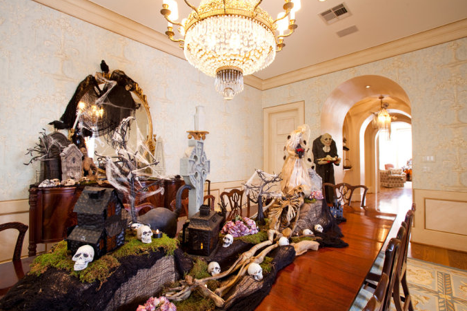 萬圣節(jié)當天,餐桌是必須要布置的,畢竟我們是要吃飯的。圖中餐桌上的黑南瓜及食物,黑白配的燭臺,再加上骷髏頭,好像在以食物祭拜祖靈及善靈以祈平安渡過嚴冬一樣,還是一款不錯的家具布置吧!