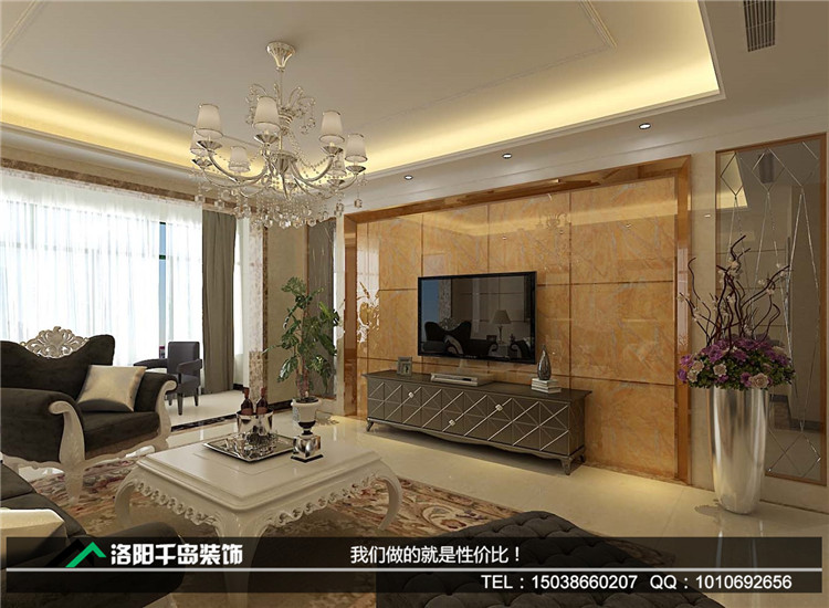 歐式的電視背景墻,選用亮面石材,將大理石被劃分成長(zhǎng)方形塊,光滑的質(zhì)地將墻面襯托得優(yōu)雅奢華。