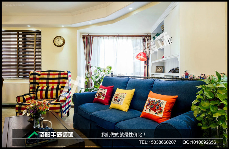 這款色彩鮮明的沙發(fā)是典型的美式沙發(fā),色彩張揚(yáng)奔放卻又十分和諧,三個(gè)顏色不一的靠枕與沙發(fā)對(duì)比強(qiáng)烈,,側(cè)面的格子沙發(fā)更顯溫馨。